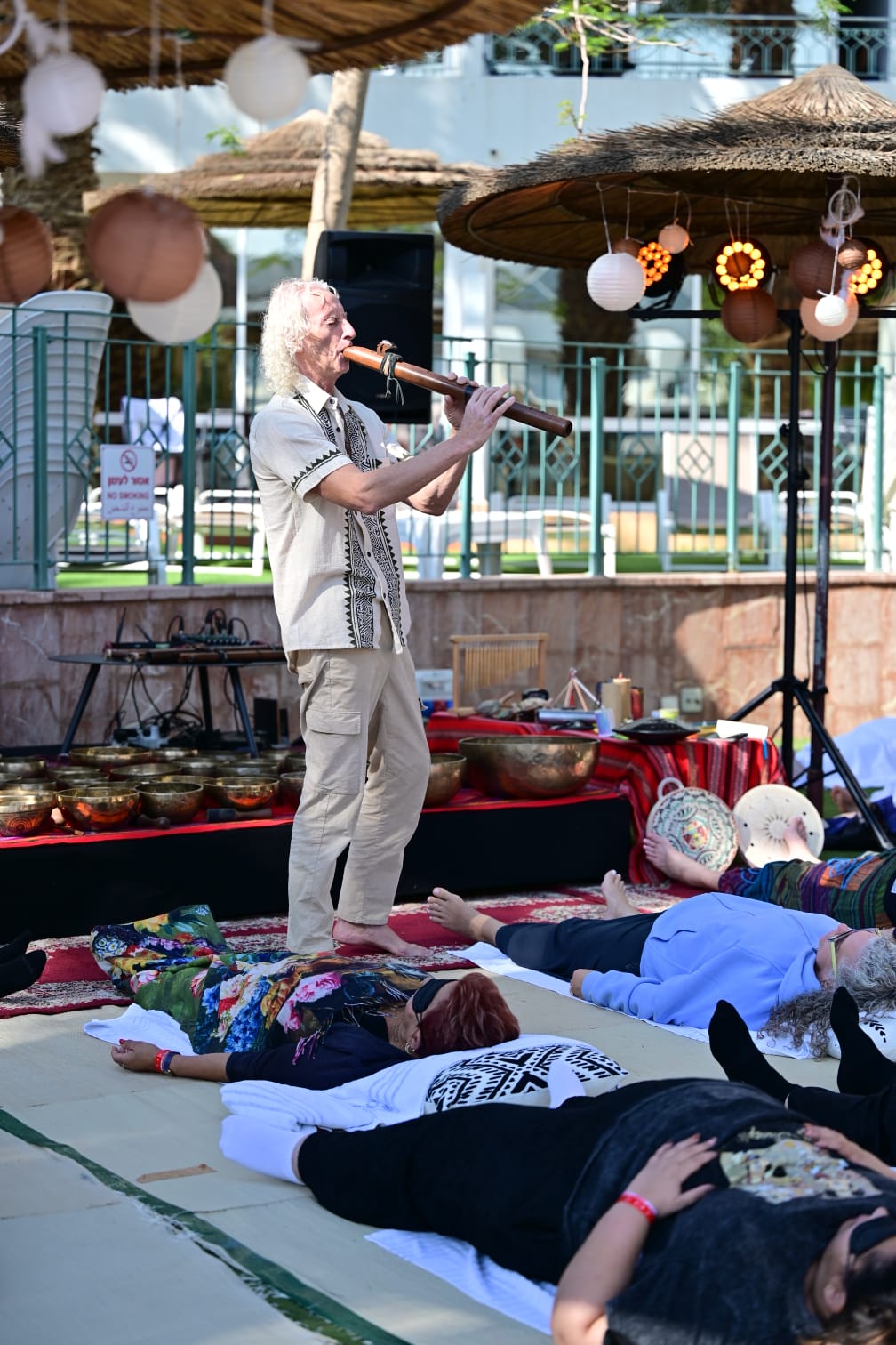 כל משתתף מקבל מזרן או מגבת לשכב ואנו מתחילים עם ניגון רצוף והרמוני עם חליל אינדיאני אשר מכניס את המשתתפים לאווירה מרגיעה.